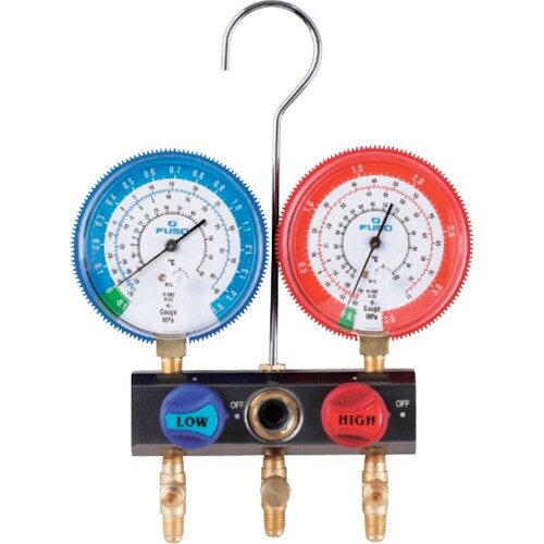 流通口径が大きいので真空引時間、冷媒充填時間が短縮されます。脈動振動吸収式ゲージなので針の振れが少なく読みとりやすいゲージです。冷凍空調設備の冷媒ガスの充填回収に。