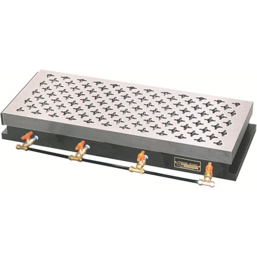 チャック作業面の吸入孔は、ネジバルブとバルブの組合せ調整により、ワークの形状に合せた圧着面積の効果的な設定ができます。大気圧を応用した圧着保持装置です。