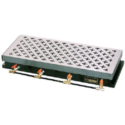 チャック作業面の吸入孔は、ネジバルブとバルブの組合せ調整により、ワークの形状に合せた圧着面積の効果的な設定ができます。大気圧を応用した圧着保持装置です。 |