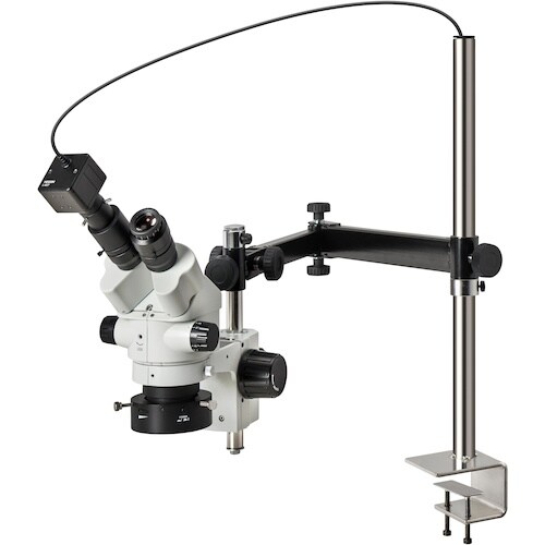 観察作業が楽なズーム式 & カメラで確認・保存自由度の高いロングアーム(リング照明付)観察作業が楽に行えるズーム式の実体顕微鏡と、価格と性能を両立した300万画素USBカメラのセットです。 |