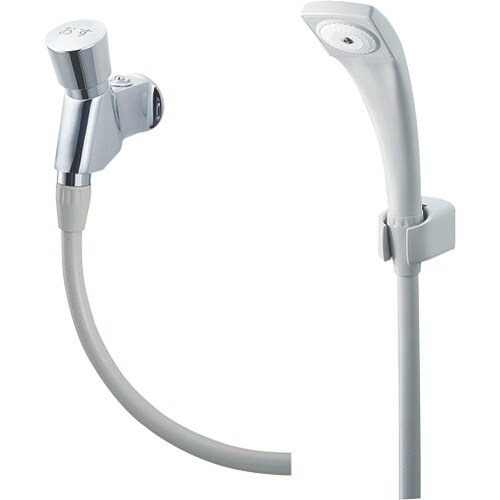 水の出しっぱなしを防ぎます。ハンドルを押せば吐水し、一定時間で止水します。吐出量調節ネジで1回の吐水量を調節することができます。壁付けタイプのハンドシャワーです。 |