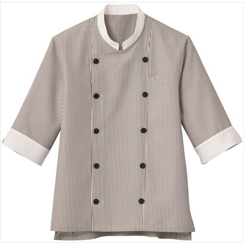 爽やかストライプの衛生対策機能が充実したショップコートです。塩素系漂白剤による退色を防ぐ素材機能から、元の色合いが持続します。水仕事など、腕まくりの手間なく作業ができる七分袖。 |