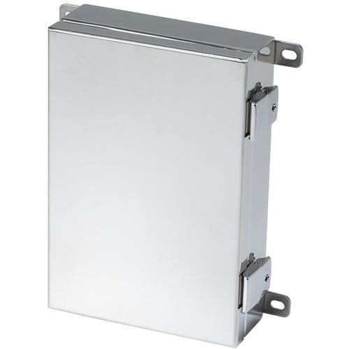 外部取付け足付きのラッチ式開閉ボックス。 耐食耐塩耐候性に優れたステンレス製です。