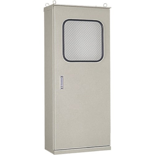 耐食性に優れたステンレス屋根付屋外用自立制御盤キャビネットです。施錠可能なステンレス防水平面ハンドルを採用しました。
