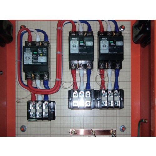 仮設動力分電盤の標準型です。大阪府の自社工場で設計、製造しています。部分的な修正・変更から、フルオーダーまで、別作対応可です。工事現場で溶接機・ポンプ・モーター・エアコン等の電源用に。 |