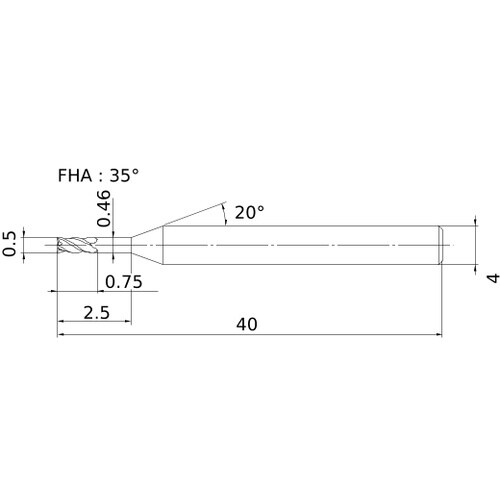 刃数ZEFP(枚):4 | 切削径DC(mm):0.5 | 最大切込みAPMX(mm):0.75 | 使用可能長さLU(mm):2.5 | 機能長さL…