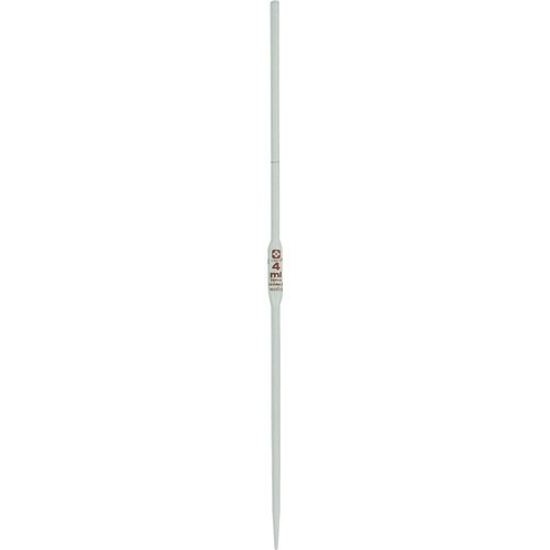 一定の体積の液体を量りとるために用いられます。全量ピペットとも呼ばれます。目盛は通常1本のみで、目盛のある部分の管径が細いため、同容量のメスピペットより目盛の精度が高いです。 |