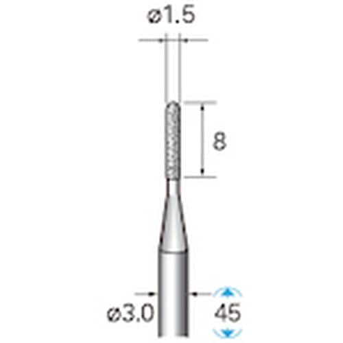 粒度(#):120 | 刃径(mm):1.5 | 刃長(mm):8 | 軸径(mm):3 | 全長(mm):45 | 最高使用回転数(rpm):105…