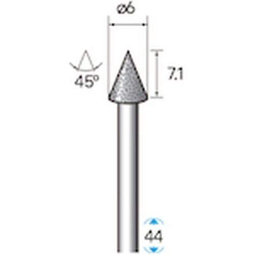 粒度(#):120 | 刃径(mm):6 | 刃長(mm):7.1 | 軸径(mm):3 | 全長(mm):44 | 最高使用回転数(rpm):670…