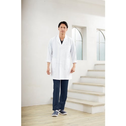 ゆとりのある袖ぐりで動きやすく、繊細なディテールにこだわった上質な男性用ドクターコートです。 |