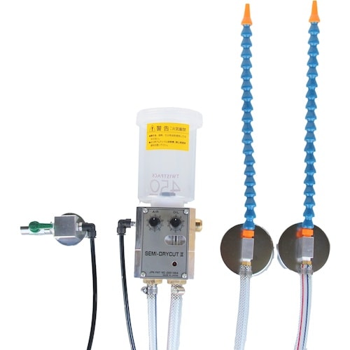 マイクロミスト噴霧で、セミドライ加工が可能です。極少量の切削油での加工が可能で後処理も簡単です。切削面の向上と工具寿命の改善効果があります。ノズル数を選択できます。 |