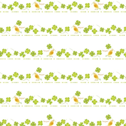 ファンシーなクローバー柄の包装紙です。四つ葉を小鳥が運んでいる柄です。 |