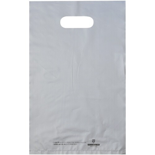 ポリエチレン製の手抜きタイプの手提げ袋です。パリッとしたハードタイプ。本体裏面にバーコード等情報が記載されています。 |
