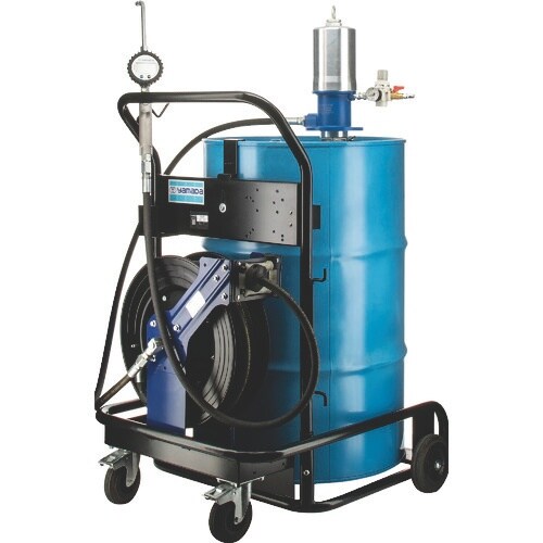 台車に200Lドラム缶を搭載する可搬型のオイルポンプセットです。車両や機械へのオイル給油に便利です。 |