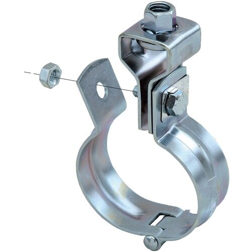バンドは中央で蝶番継ぎになっていますので、配管用鋼管への取り付けがスムーズに行えます。構造鋼管から吊りボルトを下げることもできます。 |