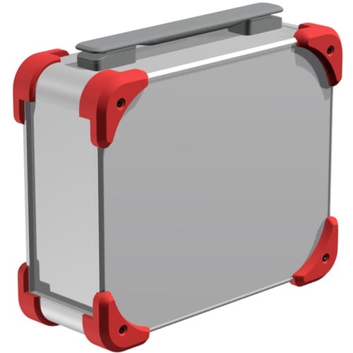 キャリングハンドル付の耐衝撃型アルミケースです。コーナーガードは弾力性のあるTPE (エラストマ) 製で、 滑りにくくゴム足の役割にもなります。