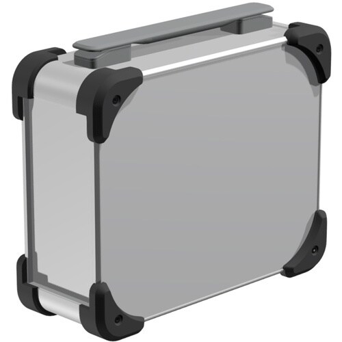 キャリングハンドル付の耐衝撃型アルミケースです。コーナーガードは弾力性のあるTPE (エラストマ) 製で、 滑りにくくゴム足の役割にもなります。