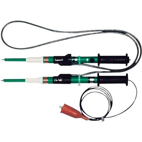 高圧開閉器塔、変圧器塔などの検電端子・検電帯において、1台で検相、相回転チェックができます。電源スイッチは先端検知子を活線に近づけるだけで入る自動式です。 |