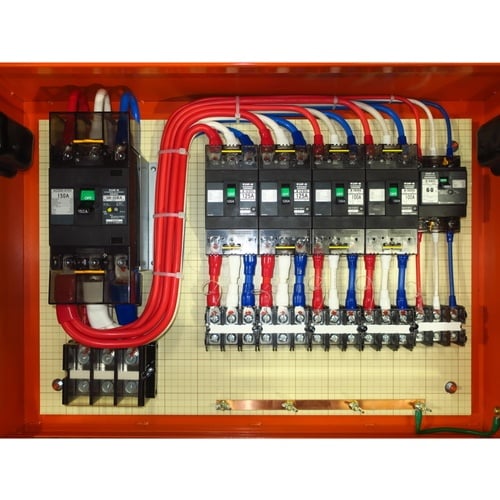 仮設動力分電盤の標準型です。大阪府の自社工場で設計、製造しています。部分的な修正・変更から、フルオーダーまで、別作対応可です。工事現場で溶接機・ポンプ・モーター・エアコン等の電源用に。 |