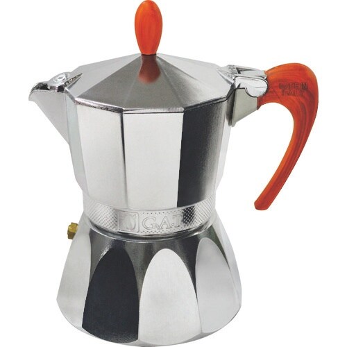 モカポットです。IH対応可です。イタリアデザインの流れるフォルム、しゃれたカラー、持ちやすいハンドルが特徴です。3ー5分で美味しいエスプレッソが出来上がります。コーヒーマシンに。 |
