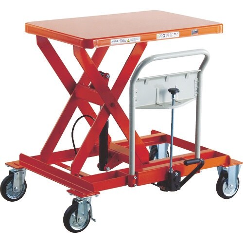 荷物の重さによって上昇ピッチが自動的に切り替わる油圧式の早送り装置付です。自在車輪には安全ブレーキを装備しています。高耐久性の油圧ポンプに強靭なシリンダを装備し、安全で快適な昇降を実現します。 |