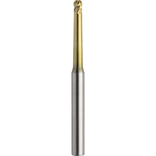 高硬度材加工用4 枚刃テーパネックラジアスエンドミルです。先端から外周へスムーズにつながるコーナR形状により切削抵抗を低減し、不等分割形状によりビビリ振動を抑制します。 |