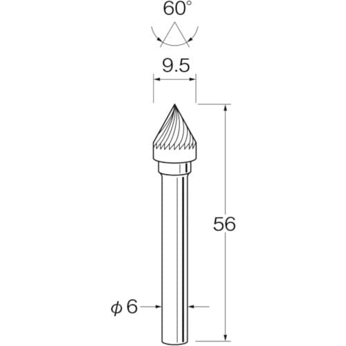 刃径(mm):9.5 | 軸径(mm):6 | 全長(mm):56 | 最高使用回転数(rpm):20000 | オール超硬・ロー付:ロー付 | 角度…