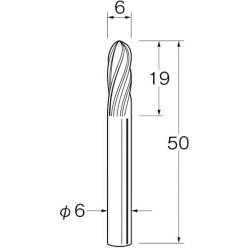 刃径(mm):6 | 刃長(mm):19 | 軸径(mm):6 | 全長(mm):50 | 最高使用回転数(rpm):28000 | オール超硬・ロー…