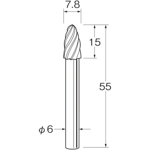 刃径(mm):7.8 | 刃長(mm):15 | 軸径(mm):6 | 全長(mm):55 | 最高使用回転数(rpm):25000 | オール超硬・…