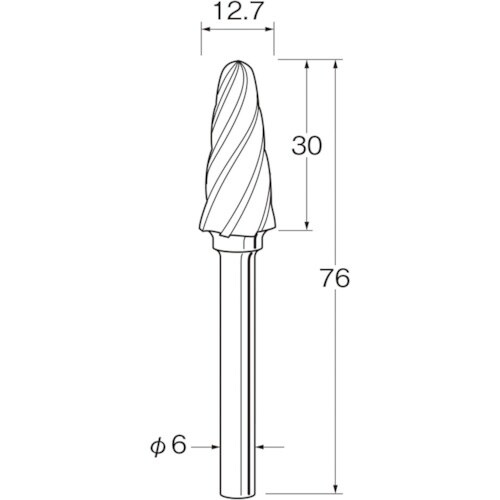 刃径(mm):12.7 | 刃長(mm):30 | 軸径(mm):6 | 全長(mm):76 | 最高使用回転数(rpm):15000 | オール超硬…