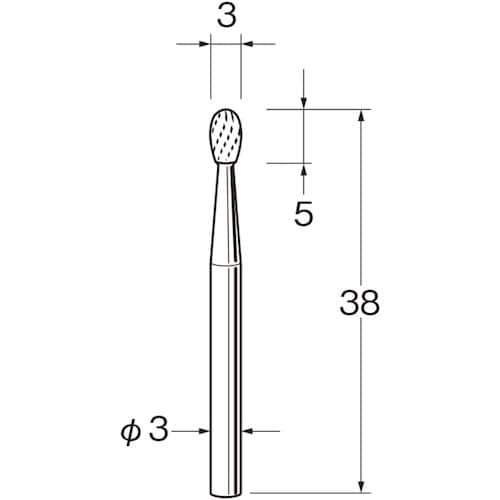 刃径(mm):3 | 刃長(mm):5 | 軸径(mm):3 | 全長(mm):38 | 最高使用回転数(rpm):40000 | オール超硬・ロー付…