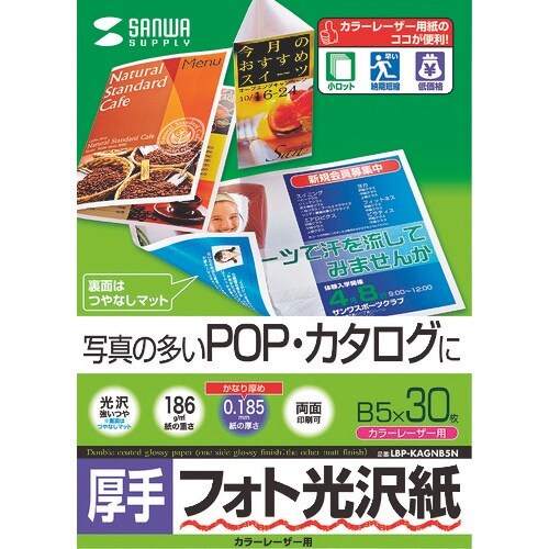 写真の多い、POP・カタログに最適です。フォト光沢・厚手タイプのカラーレーザー専用紙です。高級感のある超光沢仕上のカラーレーザー専用紙です。写真画像も文字も鮮明な印字を実現します。 |