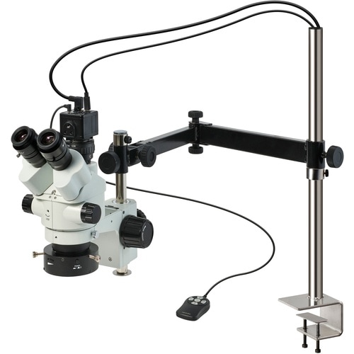 カメラが接続できるズーム式 & モニター用カメラ自由度の高いロングアーム(リング照明付)撮影と観察作業が同時に行える三眼実体顕微鏡と、HDMIでモニターに映像を出力できるフルHDのカメラのセットです。 |