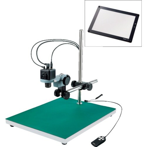 HDMIカメラ×高画質な低倍率レンズです。高さもある大きい観察対象に最適(面発光照明付)です。HDMIでモニターに映像を出力できるフルHDのカメラのセットです。様々な拡大検視に。 |