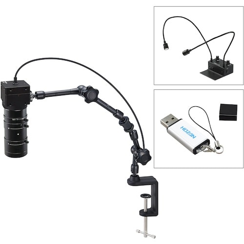 高性能USBカメラ × 作動距離自在のズームレンズ 自由にカメラを固定できるアーム(スポット照明付) 堅牢で取付ネジを多数備えた500万画素USBカメラのセットです。 |