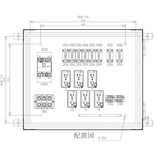仮設電灯分電盤の標準型です。大阪府の自社工場で設計、製造しています。部分的な修正・変更から、フルオーダーまで、別作対応可です。工事現場のコンセント、照明や工具等の電源に。 |