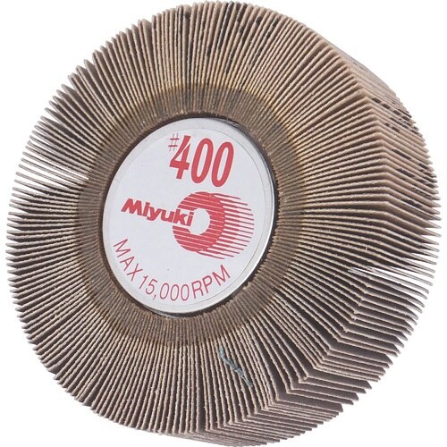 粒度(#):400 | 最高使用回転数(rpm):15000 | 外径X幅X軸径(mm):80X25X6 | その他仕様:軸付フラップホイールの斜め植…
