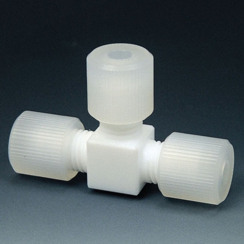 T字型チューブ接続ジョイントです。Wフェルール式のジョイントでは、耐圧が常温で0.8Mpaまでもちます。機能上液がスムーズに流れるように流量抵抗が少ない設計となっています。 |