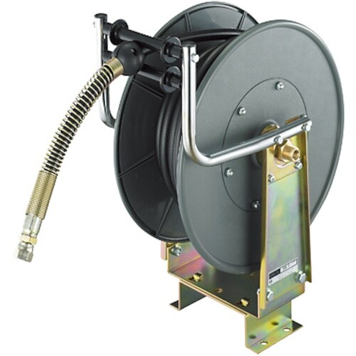 樹脂ドラムで軽量かつスムーズな引き出しトルクです。本来のロック機構を外し、止まらない仕様です。機械や装置へ組付け、高圧水の供給用に。装置などの直線的な動きに連動した巻取り機として。 |