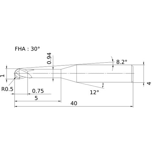 刃数ZEFP(枚):2 | 切削径DC(mm):1 | ボール半径RE(mm):0.5 | 最大切込みAPMX(mm):0.75 | 使用可能長さLU…