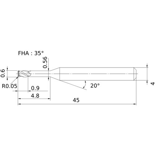 刃数ZEFP(枚):4 | 切削径DC(mm):0.6 | コーナ半径RE(mm):0.05 | 最大切込みAPMX(mm):0.9 | 使用可能長さ…