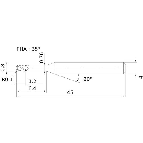 刃数ZEFP(枚):4 | 切削径DC(mm):0.8 | コーナ半径RE(mm):0.1 | 最大切込みAPMX(mm):1.2 | 使用可能長さL…