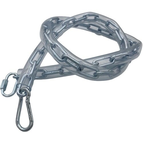 溶接チェーンは切断済み、両側にフックと保護チューブを取り付けています。スチール製ですが、ユニクロ鍍金を施しており防錆性・耐候性に優れています。転倒防止、進入禁止、境界用の仕切りに。 |