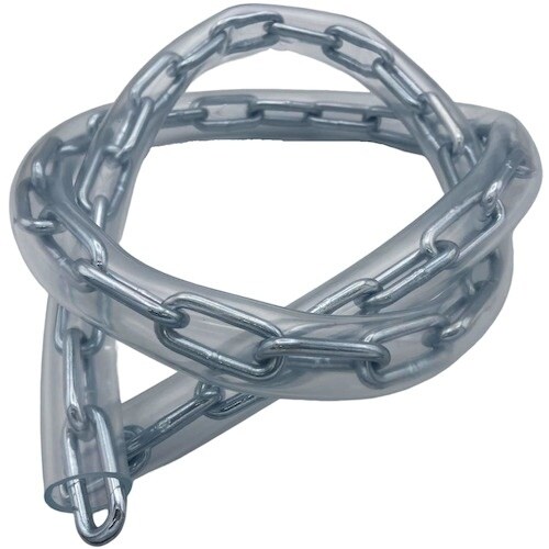 溶接チェーンは切断済み、保護チューブ付きです。スチール製ですが、ユニクロ鍍金を施しており防錆性・耐候性に優れています。転倒防止、進入禁止、境界用の仕切りに。 |