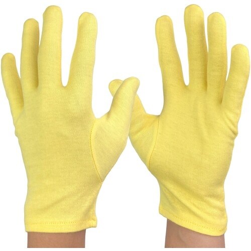 編み目のしっかり詰まった黄色の綿手袋です。安価で吸汗性に優れインナー手袋から作業用途、手荒れ予防まで様々な用途にご使用出来ます。 |