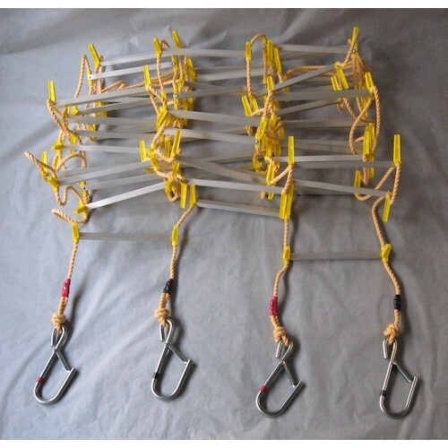 三列一体型の縄ばしごです。揺れが少なく降りやすいです。ロープの芯にワイヤーが入っているのでロープが伸びにくく揺れが少ない。ステップの突起物(脚)が壁面にあたり、足を掛けやすい。 |