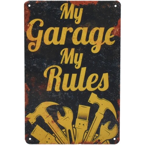 ヴィンテージ風のブリキ看板です。四角にはそれぞれ丸穴が開いており、簡単に留めることが可能です。 |