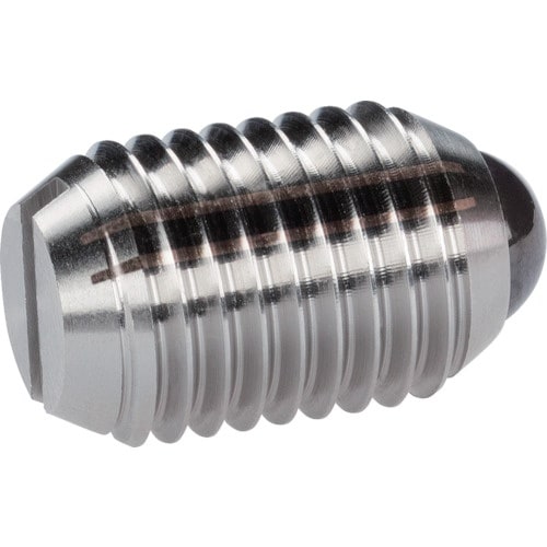 ねじ込み、ボールタイプのプランジャーです。ステンレス鋼を使用し、特に高い耐食性を持っています。ボールはセラミック球を使用し衝撃に強い、耐摩耗性が高い、磁化しない、絶縁性が高いという特長があります。 |
