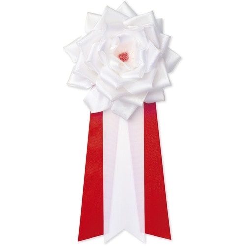 式典の記章です。一般的に赤か桃を招待客、白が主催者側になります。