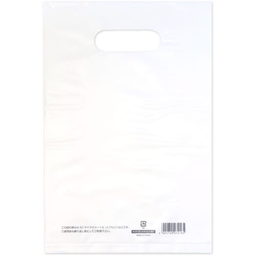 ポリエチレン製の手抜きタイプの手提げ袋です。パリッとしたハードタイプ。本体裏面にバーコード等情報が記載されています。